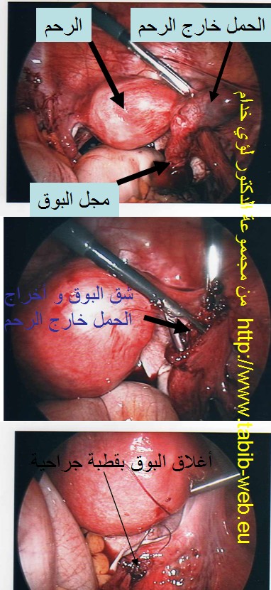 الصورة أعلاه تظهر الحمل خارج الرحم الذي عشش على البوق الأيمن. تم العلاج بالجراحة التنظيرية، حيث أجري شق بالبوق استخرج منع الحمل، و تم اغلاق البوق بقطبة جراحية بحيث تمت المحافظة على البوق